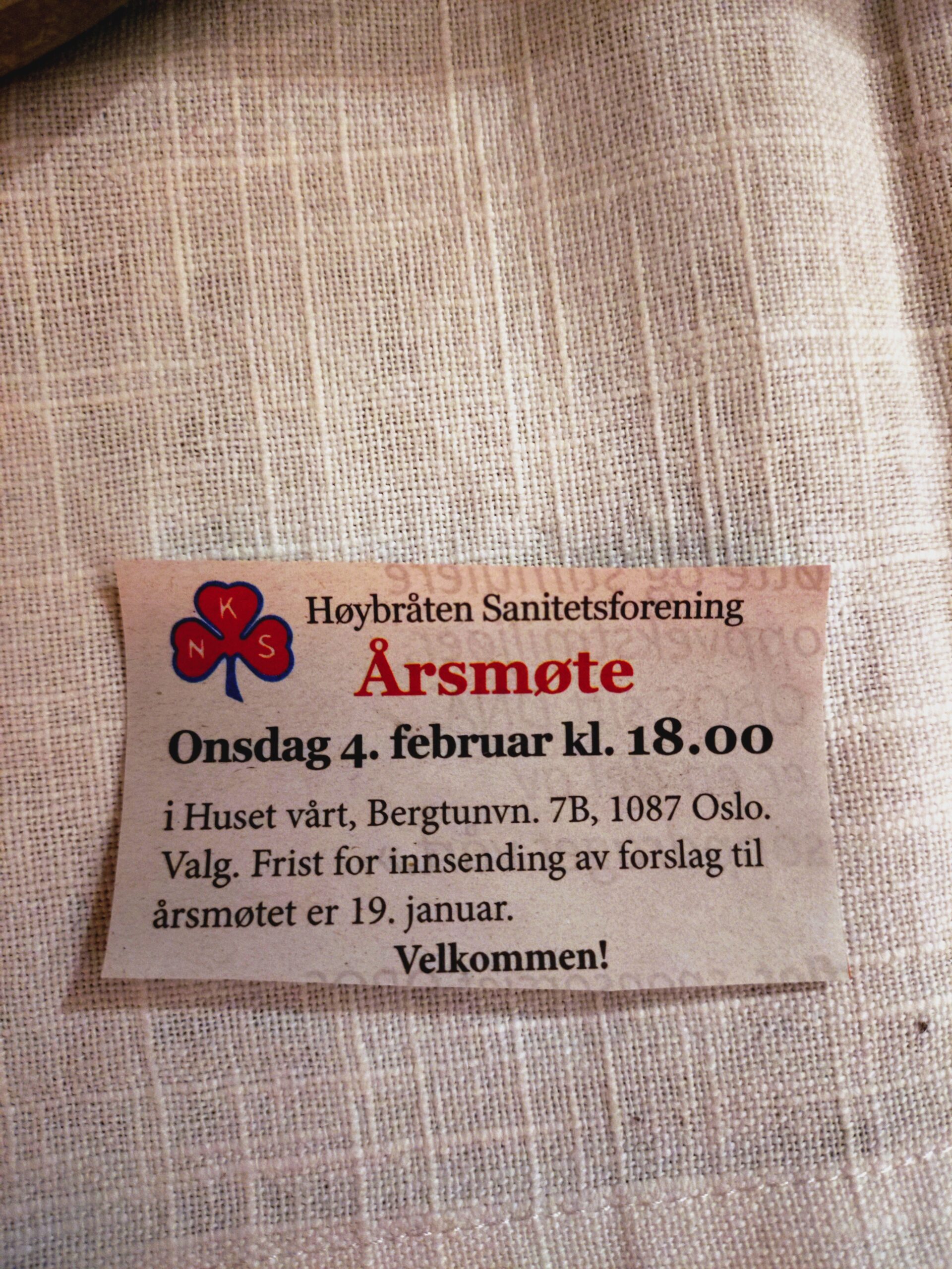 Bergtunveien 7 b Oslo,NorwayHøybråten sanitetsforening avholder årsmøte for medlemmer 4. februar kl. 18.00 Bergtunveien 7 b i "Vårt hus". Servering og lotteri - ta med gevinst! Innkalling er sendt til alle medlemmer. Frist…